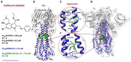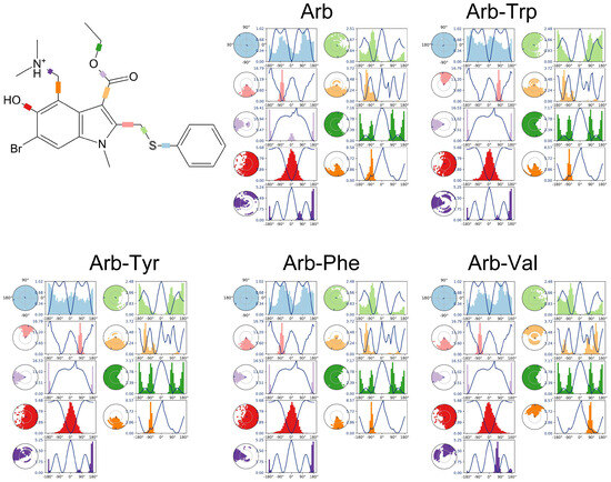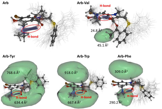 A comprehensive MD + QC methodology was developed and applied to evaluate various aspects of Arbidol interactions with functional amino acids of surface proteins of influenza virus and SARS-CoV-2. The spatial structure, solvation features, conformational behavior of Arb AA (AA–Trp, Tyr, Phe, and