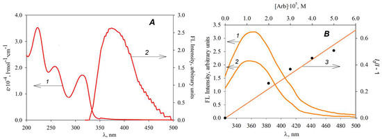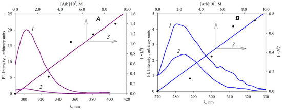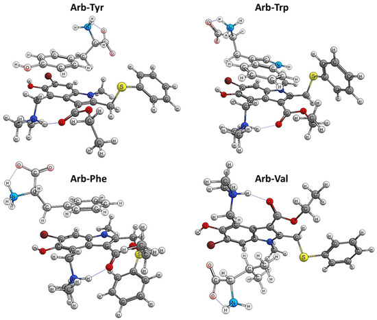 A comprehensive MD + QC methodology was developed and applied to evaluate various aspects of Arbidol interactions with functional amino acids of surface proteins of influenza virus and SARS-CoV-2. The spatial structure, solvation features, conformational behavior of Arb AA (AA–Trp, Tyr, Phe, and Val) complexes were established, and the statistics of intermolecular interactions in the complex were described. It was found that Arb can participate in strong and long-lived π-π stacking interactions with aromatic amino acids. The binding energy (BE) of Arbidol and amino acids in aqueous solution was estimated using an explicit solvation model, QTAIM analysis and correlation of BE vs. total electron density at the bond critical points of the complex. Theoretical calculations were validated by experimental studies of fluorescence (FL) quenching of aromatic AA by Arbidol. Spectral-fluorescent properties of Arbidol hydrochloride in aqueous solutions were studied, and the luminescence quantum yield for the electronically excited state of Arb was determined.