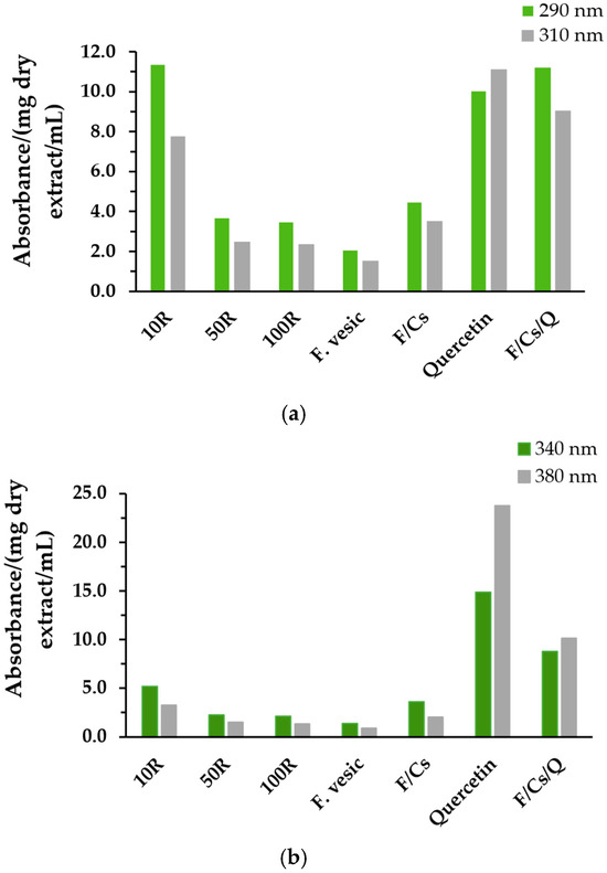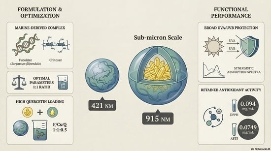 Brown algae are a valuable source of bioactive secondary metabolites, particularly polyphenols and sulfated polysaccharides with photoprotective and antioxidant activities. Among them, fucoidan stands out for its biocompatibility, biodegradability, and demonstrated photoprotective effects, mainly through antioxidant and anti-photoaging properties, making it a promising natural component for UV-protective formulations. This study developed polyelectrolyte complex sub-micron particles based on fucoidan and chitosan (F/Cs) to encapsulate quercetin (Q) as a natural UV-active antioxidant. Fucoidan from Sargassum filipendula was extracted and fractionated by ultrafiltration. An RCBD was used to optimize pH and F/Cs mass ratio. The optimal blank formulation (F/Cs = 1:1, pH 5.0) yielded sub-micron colloidal carriers with a mean hydrodynamic diameter of 421 ± 23 nm (PDI 0.252 ± 0.059) with ζ = +43.5 ± 1.6 mV. Quercetin-loaded particles (F/Cs/Q = 1:1:0.5) presented 915 ± 87 nm (PDI 0.278 ± 0.093) and ζ = +54.6 ± 1.2 mV. UV–Vis spectra evidenced UVB and partial UVA absorption for fucoidan and broad UVA/UVB coverage for quercetin, preserved upon encapsulation. Antioxidant activity was retained post-encapsulation (EC50, DPPH: 0.094 mg/mL; ABTS: 0.0749 mg/mL). These results demonstrate the potential of fucoidan–chitosan colloidal systems as multifunctional, biodegradable carriers for natural photoprotective agents, supporting their application in next-generation dermatological and cosmeceutical formulations.
