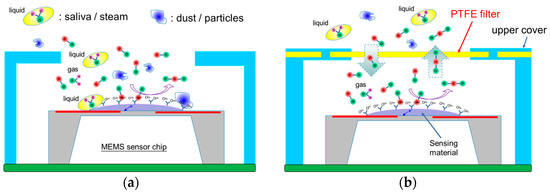 Dust or condensed water present in harsh outdoor or high-humidity human breath samples are one of the key sources that cause false detection in Micro Electro-Mechanical System (MEMS) gas sensors. This paper proposes a novel packaging mechanism for MEMS gas sensors that utilizes
