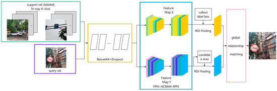 Traffic signs are updated quickly, and there image acquisition and labeling work requires a lot of manpower and material resources, so it is difficult to provide a large number of training samples for high-precision recognition. Aiming at this problem, a traffic sign recognition method based on FSOD (few-shot object learning) is proposed. This method adjusts the backbone network of the original model and introduces dropout, which improves the detection accuracy and reduces the risk of overfitting. Secondly, an RPN (region proposal network) with improved attention mechanism is proposed to generate more accurate target candidate boxes by selectively enhancing some features. Finally, the FPN (feature pyramid network) is introduced for multi-scale feature extraction, and the feature map with higher semantic information but lower resolution is merged with the feature map with higher resolution but weaker semantic information, which further improves the detection accuracy. Compared with the baseline model, the improved algorithm improves the 5-way 3-shot and 5-way 5-shot tasks by 4.27% and 1.64%, respectively. We apply the model structure to the PASCAL VOC dataset. The results show that this method is superior to some current few-shot object detection algorithms.