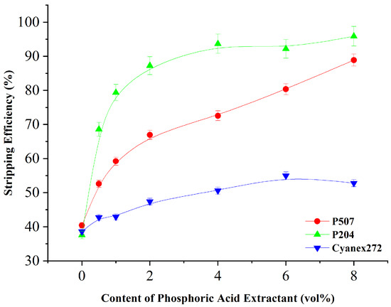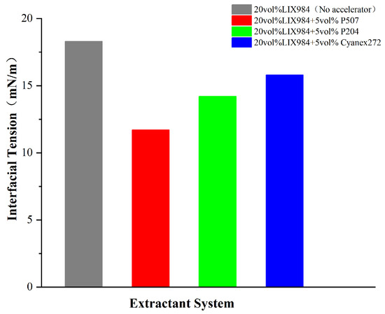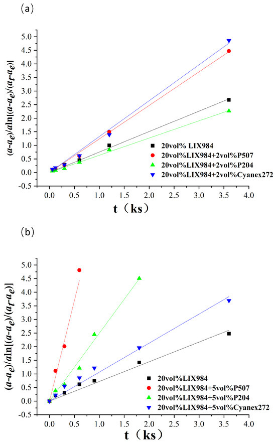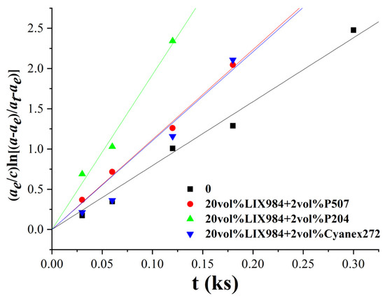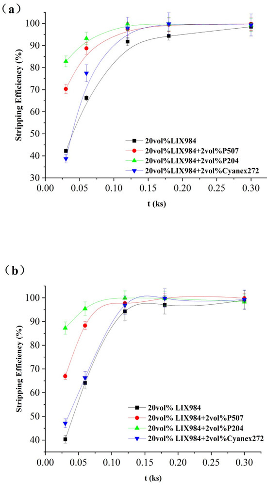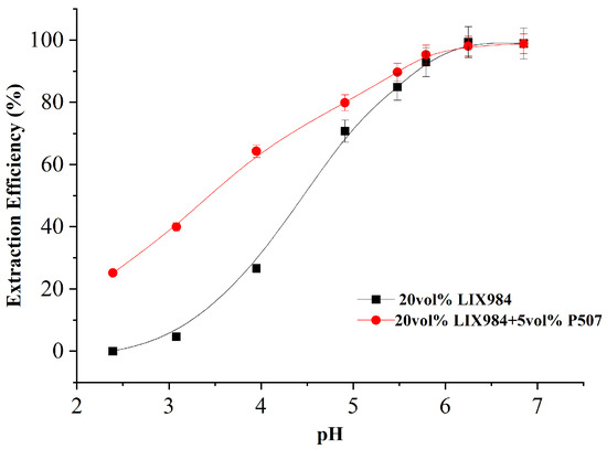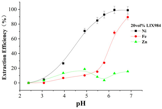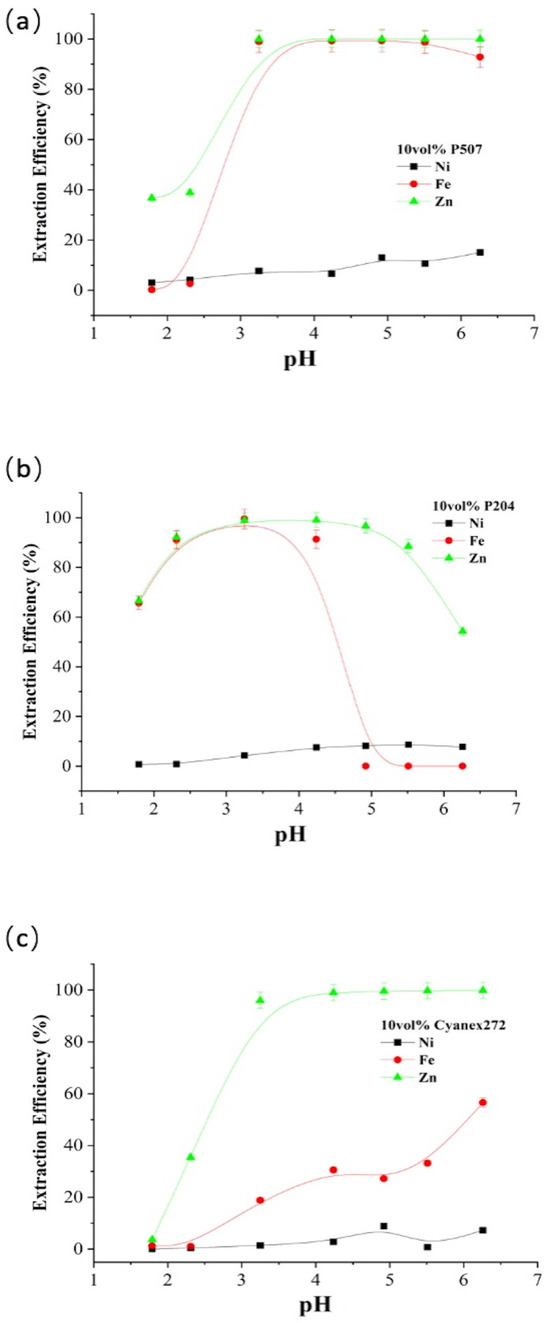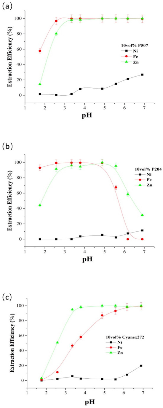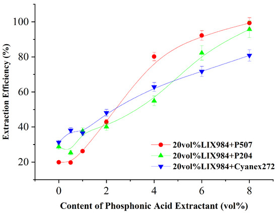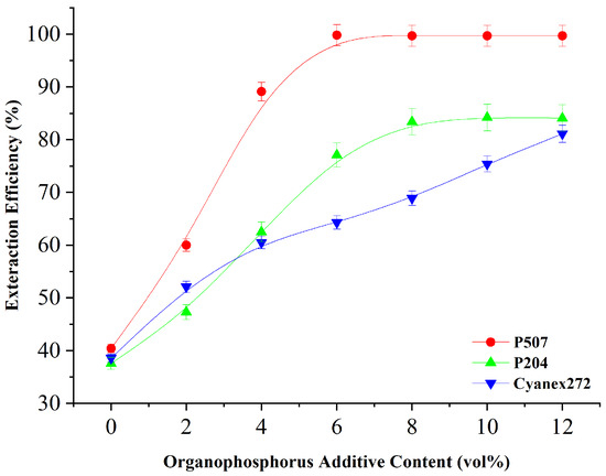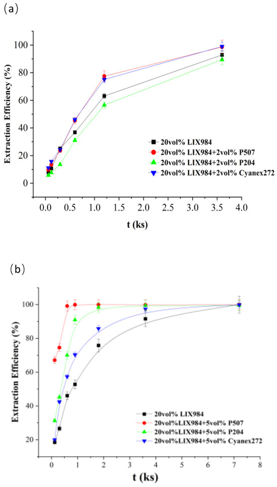 Hydroxamic acid extractants, such as LIX984, demonstrate high efficiency in extracting nickel from electron-free nickel waste solutions; however, they suffer from a slow extraction rate. This study investigated the effect of adding 2–5 vol.% of three organophosphate extractants (P507, P204, and Cyanex272) to