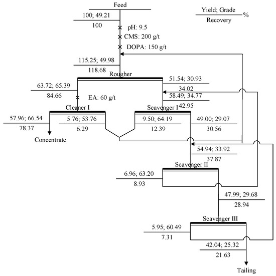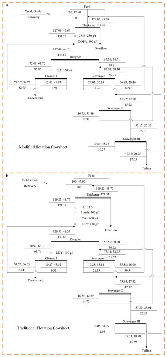 An eco-friendly flotation process is of great significance to the green and sustainable development of the mining industry. The purpose of this study is to improve the traditional flotation process. Novel reagents, alkyl ether amine (Alkyl carbon chains with a length of 12