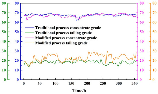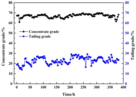 An eco-friendly flotation process is of great significance to the green and sustainable development of the mining industry. The purpose of this study is to improve the traditional flotation process. Novel reagents, alkyl ether amine (Alkyl carbon chains with a length of 12 are simply referred to as DOEA) as collector and carboxymethyl starch (CMS) as depressant, were used for flotation uAlkyl ether aminender lower temperature, which did not need to heat the tonnage of pulp and reduced the energy consumption. The micro-flotation tests were carried out with three main minerals (quartz, hematite and magnetite) contained in Qidashan (Anshan, China) iron ore at room temperature in winter (18 °C). The bench-scale tests were carried out with flotation feed (mixture of strong magnetic concentrate and weak magnetic concentrate) from the Qidashan flotation workshop at room temperature (18 °C). And the industrial tests were carried out in the flotation workshop of Qidashan Concentrator of Anshan Iron and Steel Co., Ltd. The temperature of the pulp was 17.5~19.7 °C. The results of micro-flotation tests showed that the floatability of the three minerals under the DOEA system decreased in the following order: quartz > hematite > magnetite. The addition of CMS increased the floatability difference between quartz and ferric oxide minerals. DOEA and CMS could effectively separate quartz and ferric oxide minerals at room temperature in winter. The feasibility of the application of DOEA and CMS in Qidashan iron ore was verified by bench-scale tests, and the pulp circulation process was simulated by locked-cycle tests. The results of bench-scale tests showed that under the conditions of CMS dosage 200 g/t, DOEA dosage 150 g/t, and pulp temperature 18 °C, the iron grade of flotation concentrate was 66.54% and iron recovery was 78.37%. The industrial test results showed that the modified flotation process could continuously output qualified iron concentrate without heating the pulp. Compared with the on-site flotation process, it was found that the modified flotation process could save USD 6,460,100 per year. This technology could significantly reduce the energy consumption of iron ore reverse flotation, reduce the carbon emissions generated by heating tons of pulp, and achieve cleaner production.