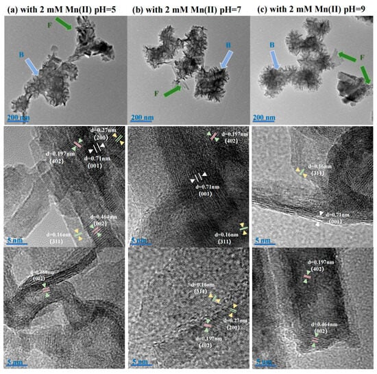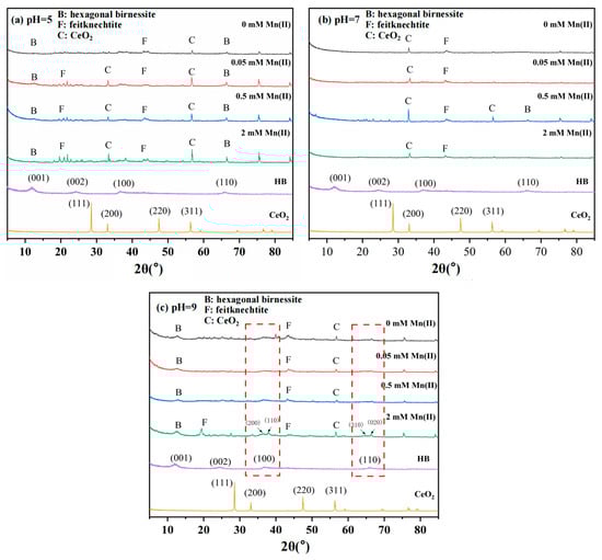 Birnessite has a strong ability to fix rare-earth elements (REEs), but the transformation process of birnessite and its effects on the migration of these elements are not well understood. This study examines how pH and Mn(II) concentrations influence the transformation of cerium-adsorbed hexagonal birnessite (Ce/HB) and the behaviors of Ce and Mn. The results show that the effect of Mn(II) on Ce/HB transformation strongly depended on solution pH. At a pH of 5.0, HB initially underwent transformation into feitknechtite, followed by further disproportionation that resulted in the regeneration of HB and Mn(II). Concurrently, redox reactions occur between Mn(IV) in MnO2 (a secondary phase of HB) and Ce(III)/Mn(II), creating a local redox gradient that facilitates partial HB transformation. At pH = 7.0, Mn(II) reduces the crystallinity of transformed products while enhancing the thermodynamic stability of feitknechtite, making it the dominant manganese oxide phase. At pH = 9.0, high-concentration Mn(II) causes lattice distortion in original HB; Ce(III) acts as a structural inducer, promoting mineral transition from hexagonal to orthorhombic symmetry, while excess soluble Mn(II) precipitates new feitknechtite. Additionally, surplus Mn(II) could engage in interfacial redox reactions with high-valent manganese oxides to generate secondary feitknechtite. Ce primarily exists as Ce(IV), forming CeO2 on the mineral surface via oxidation reactions that significantly increase hydroxylation and surface reactivity. This study clarifies the transformation pathways of manganese oxides and the migration and transformation patterns of Ce and Mn in rare-earth-rich mining areas.