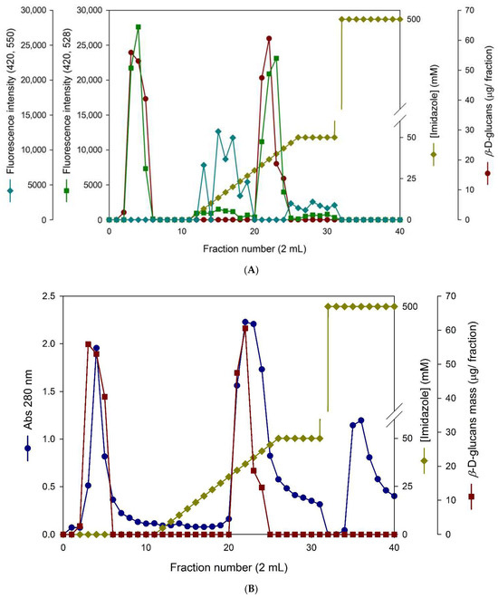Fruit and coffee industries are responsible for huge quantities of agro-industrial wastes which is of great environmental and public health concern. Therefore, the aim of this work involves the use of such wastes for the production of β-D-glucan from basidiomycete strains which are powerful biological response modifiers in several clinical disorders. Experimental planning for optimization of several parameters was carried out by a full factorial of two levels of three factors for production of beta-glucans and basidiomycete species, where waste concentration and interaction between species and agro-industrial waste were the most important factors. The best conditions involved a basidiomycete strain of Lentinula edodes in a culture medium containing 400 g/L of waste coffee grounds which revealed the production of extracellular β-glucans (141.16 mg/L) at the 3rd day of fermentation. Intrinsic fluorescence properties of mushroom β-D-glucan were investigated by fluorescence spectroscopy as well as a fluorescence microtiter plate reader exhibiting emission peaks at 492 and 528 nm. Differential chromatographic behavior of β-D-glucan was investigated by immobilized metal affinity chromatography (IMAC) using epoxy-activated Sepharose 6B containing different chelating agents, spacer arms, and metal ions. One-step purification of β-D-glucan was devised using a column of epoxy-activated Sepharose 6B-IDA-Cu (II). FTIR analysis of several β-D-glucans from the chromatographic fractions was carried out to investigate their structural properties.