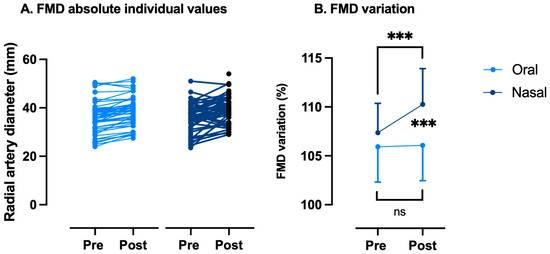 Nitric oxide (NO) plays a crucial role in muscle oxidative capacity, which predicts muscle strength. This study aimed to investigate whether different breathing techniques (nasal or oral breathing) affect muscle performance during acute exhaustive exercise. In our study, 49 healthy individuals (24♀/25♂; age 22.8 ± 3.4 years) performed two Wingate anaerobic tests in a counterbalanced order. Although perceived exertion was significantly higher with oral breathing (Borg Scale: 9.0 ± 1.1 vs. 8.0 ± 1.3, p = 0.04), breathing mode did not impact power output (peak: 749 ± 290 vs. 728 ± 284 W; average: 576 ± 217 vs. 575 ± 216 W, p = 0.2). NIRS data indicated no significant differences in muscle desaturation between the two breathing modes; however, nasal breathing resulted in significantly faster (0.45 ± 0.4 vs. 0.23 ± 0.12%/s, p = 0.02) and greater (75.2 ± 4.0 vs. 73.1 ± 3.6%, p = 0.04) post-exercise muscle recovery. As an indirect marker of NO bioavailability, flow-mediated dilation (FMD) was associated with a significant improvement (Pre: 107.4 ± 3.0% vs. Post: 110.3 ± 3.6%, p < 0.001) via nasal breathing only, with a significant difference between the two breathing modes (p < 0.0001). Therefore, we suggest that the nitrate–nitrite–NO pathway enhances muscle energy and function, which highlights the importance of nasal breathing.