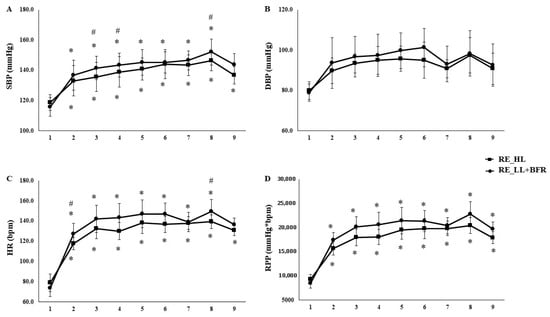 Resistance training (RT) can induce cardiovascular overload, especially at high intensities. Blood flow restriction (BFR) has emerged as a low-load alternative that is potentially effective and safe, although its hemodynamic and respiratory effects remain controversial. Background/Objectives: The aim of this study was to compare cardiovascular responses between a high-load RT session (RT_HL; 70% of one repetition maximum—1RM) and a low-load session combined with BFR (RT_LL+BFR; 30% 1RM). Methods: Nineteen trained men (24.3 ± 3.9 years; 177.7 ± 6.3 cm; 84.7 ± 13.0 kg) performed the RT_HL and RT_LL+BFR protocols, with eight exercises for each protocol. The following variables–heart rate (HR), percentage of maximum heart rate (%HRmax), systolic blood pressure (SBP), diastolic blood pressure (DBP), and rate pressure product (RPP)–were assessed during the protocols. Results: Both protocols significantly increased HR (pre: 74 ± 8 bpm; post: RT_HL = 142 ± 9 bpm; RT_LL+BFR = 133 ± 6 bpm; p < 0.01), %HRmax (RT_HL = 72 ± 5%; RT_LL+BFR = 69 ± 4%; p < 0.01), SBP (RT_HL = 144 ± 6 mmHg; RT_LL+BFR = 140 ± 6 mmHg; p < 0.05), and RPP (RT_HL = 20,469 ± 1620; RT_LL+BFR = 18,637 ± 1253; p < 0.01) compared to resting values. No variable exceeded safety thresholds for RPP (<30,000; %HRmax < 75%), and DPB showed a slight elevation in both conditions (p < 0.05), but without differences between protocols (p = 0.28). Conclusions: Exercise load intensity was an important determinant of hemodynamic responses, but BFR elicited comparable stimuli with low load, thereby emphasizing improved safety to traditional high-load-intensity training.