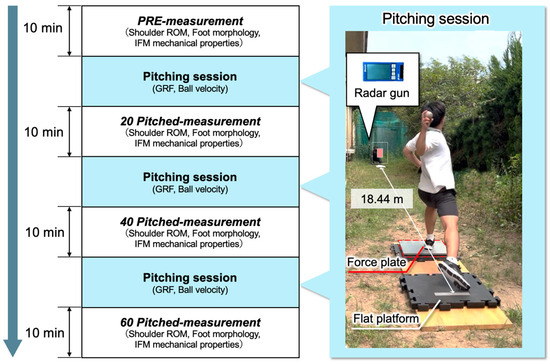 Pitching requires effective transfer of ground reaction force (GRF), and structural breakdown of the medial longitudinal arch (MLA) may influence glenohumeral internal rotation (IR) deficits. This study investigated whether changes in foot morphology of the stride leg and soft tissue characteristics are associated