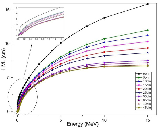 This research entailed the production of composite materials through the combination of natural rubber and acrylonitrile butadiene rubber, along with nano-silica-loaded bismuth (III) oxide, in varying concentrations ranging from 0 to 45 parts per hundred parts of rubber (phr). The gamma attenuation properties