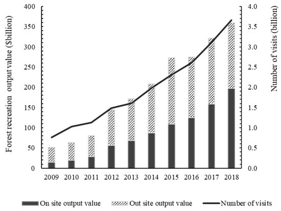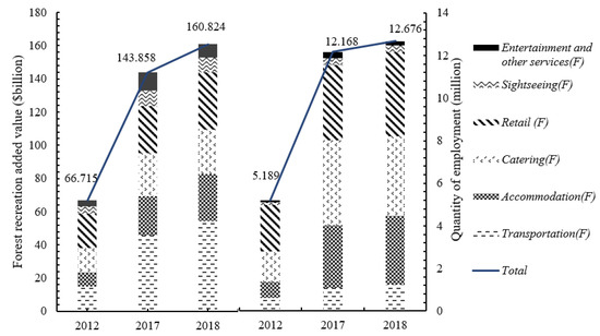 Forest recreation not only enables directly creates impacts on the entire tourism industry but also indirectly creates effects on other industries composed in an economic system via inter-industrial interdependence, such as backward and forward linkages or interactions. However, due to the lack of data available, few studies have been made exclusively for evaluating the impacts of forest recreation on the economy in a national dimension. Therefore, this paper attempts to analyze the economic impacts of the forest recreation industry. Using an input–output modeling approach, the industrial linkage and a cluster of economic multipliers are estimated based on new input–output tables for 2012, 2017, and 2018 that includes the forest recreation industry. The results indicate that, first, both the forward and backward linkages caused by forest recreation show rising trends over the analysis periods and the backward linkages are stronger than forward linkages. Second, the economic contribution of forest recreation has been strengthened, although the multipliers have shown a downward trend. The total output impact in 2018 is calculated to be $838.187 billion, with a total added impact of $352.713 billion. Furthermore, forest recreation could create over 18 million jobs with an average annual growth rate of 15.73%, which are mainly in the catering, accommodation, and retail industries with low skill requirements. Finally, policy applications are proposed to provide reliable and useful information for future planning and investment decision associated with the forestry and ecotourism industry.