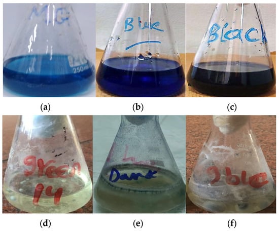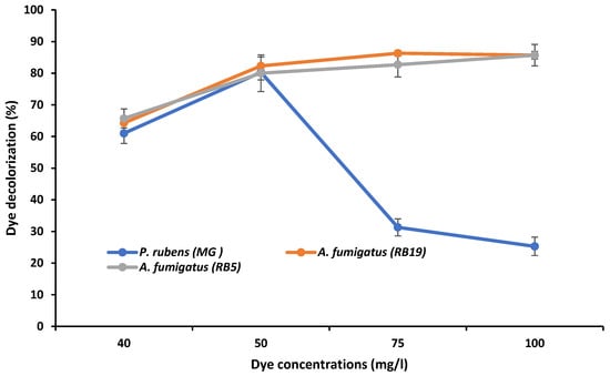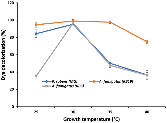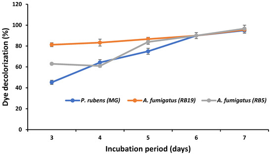 Industrial synthetic dyes are among the most common and hazardous pollutants in manufacturing wastewater. In this study, effective dye-decolorizing fungi were isolated from industrial discharge and evaluated for their decolorization efficiency for various dyes, including a triphenylmethane (malachite green, MG), an anthraquinone (reactive blue 19, RB19), and an azo dye (reactive black 5, RB5). The fungus with the highest potential for MG decolorization was identified as Penicillium rubens, whereas Aspergillus fumigatus proved to be the most effective for RB19 and RB5 decolorization. Maximum decolorization for all dyes occurred at pH 9 and 30 °C after 6–7 days of shaking in the dark. Enzyme activity assays revealed that both P. rubens and A. fumigatus produced multiple oxidative and reductive enzymes, including laccase, azoreductase, anthraquinone reductase, triphenylmethane reductase, lignin peroxidase, manganese peroxidase, and tyrosinase. The decolorized filtrates of MG, RB19, and RB5 exhibited very low phytotoxicity for RB5 and no phytotoxicity for MG and RB19. Furthermore, these filtrates demonstrated significant reductions in chemical oxygen demand (46%, 63%, and 50%) and biological oxygen demand (37%, 60%, and 40%) for MG, RB19, and RB5, respectively, compared to untreated dyes. Given their efficient biological removal of dyes under alkaline conditions, these fungal isolates are promising candidates for sustainable wastewater treatment.