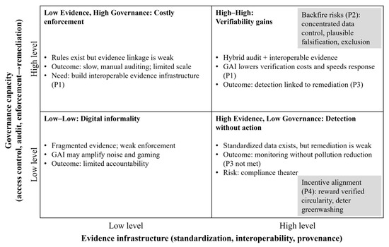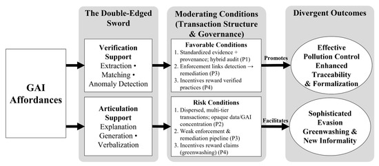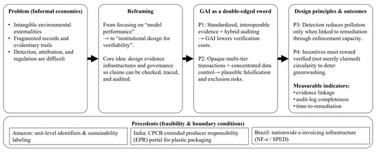 Intangible environmental externalities in informal economies are hard to detect, attribute, and regulate because transaction records and evidentiary trails are fragmented. This conceptual paper reframes pollution control from improving model performance to designing institutions for verifiability and examines how generative AI (GAI) can both strengthen and undermine that verifiability. Integrating transaction-structure theory, institutional economics, and digital-governance research, we derive four propositions: (P1) standardized, interoperable evidence and hybrid auditing allow GAI to lower verification costs; (P2) opaque, multi-tier transactions and concentrated data control enable plausible falsification; (P3) detection reduces pollution only when linked to remediation through enforcement capacity; and (P4) incentives must reward verified, not merely claimed, circularity to deter greenwashing. We illustrate feasibility and boundary conditions through three precedents: Amazon’s unit-level identifiers and sustainability labeling, India’s CPCB extended producer responsibility portal for plastic packaging, and Brazil’s nationwide e-invoicing infrastructure (NF-e/SPED). The framework offers actionable design principles, testable hypotheses, and measurable indicators (evidence linkage, audit-log completeness, time-to-remediation) for future empirical work. The framework is intended to support analytic generalization for policy and practice across contexts.