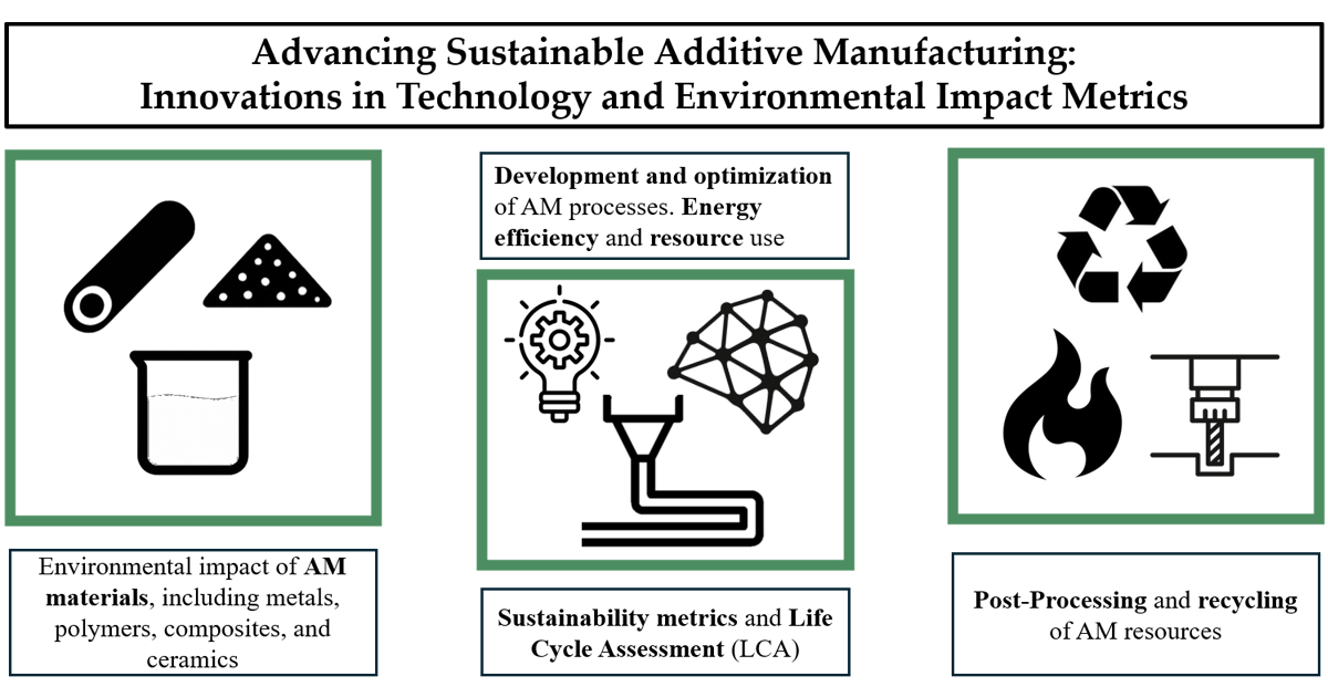 This Special Issue aims to bring together the latest research on these emerging topics in sustainable additive manufacturing. By exploring either technological innovation and the development of environmental impact metrics, we aim to provide a comprehensive overview of the current state of the art in this field, highlighting the key challenges and opportunities for advancing AM toward a more sustainable future.
