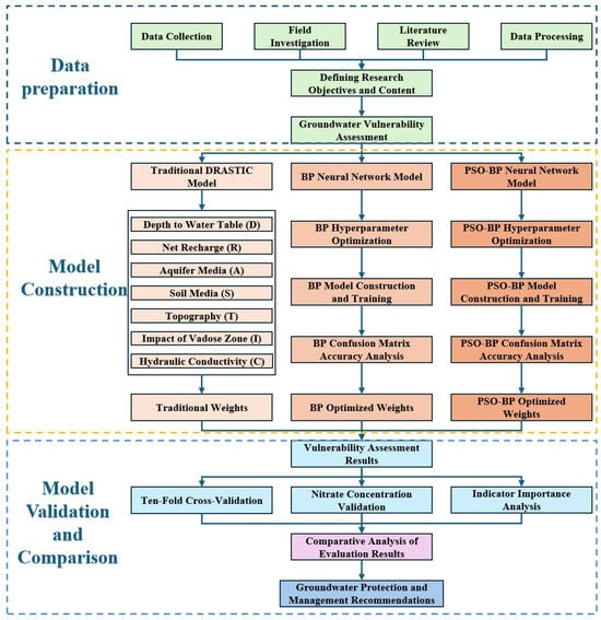 Groundwater vulnerability assessments serve as essential tools for sustainable groundwater management, particularly in regions with intensive anthropogenic activities. However, improving the objectivity and predictive reliability of vulnerability assessment frameworks remains a critical scientific challenge in groundwater science, especially for coastal aquifer systems characterized by strong heterogeneity and complex hydrogeological processes. The traditional DRASTIC model is a widely recognized method but suffers from subjectivity in assigning parameter ratings and weights, often leading to arbitrary and potentially inaccurate vulnerability maps. This limitation also restricts its applicability in areas with complex hydrogeological conditions. To enhance the accuracy and adaptability of the traditional DRASTIC model, a hybrid PSO-BP-DRASTIC framework was developed and applied it to a coastal city in China. Specifically, the model employs a backpropagation neural network (BP-NN) to optimize indicator weights and integrates the particle swarm optimization (PSO) algorithm to refine the initial weights and thresholds of the BP-NN. By introducing a data-driven and globally optimized weighting mechanism, the proposed framework effectively overcomes the inherent subjectivity of conventional empirical weighting schemes. Using ten-fold cross-validation and observed nitrate concentration data, the traditional DRASTIC, BP-DRASTIC, and PSO-BP-DRASTIC models were systematically validated and compared. The results demonstrate that (1) the PSO-BP-DRASTIC model achieved the highest classification accuracy on the test set, the highest stability across ten-fold cross-validation, and the strongest correlation with the nitrate concentrations; (2) the importance analysis identified the aquifer thickness and depth to the groundwater table as the most influential factors affecting groundwater vulnerability in Yantai; and (3) the spatial assessments revealed that high-vulnerability zones (7.85% of the total area) are primarily located in regions with intensive agricultural activities and high aquifer permeability. The hybrid PSO-BP-DRASTIC model effectively mitigates the subjectivity of the traditional DRASTIC method and the local optimum issues inherent in BP-NNs, significantly improving the assessment accuracy, stability, and objectivity. From a scientific perspective, this study demonstrates the feasibility of integrating swarm intelligence and neural learning into groundwater vulnerability assessment, providing a transferable and high-precision methodological paradigm for data-driven hydrogeological risk evaluation. This novel hybrid model provides a reliable scientific basis for the reasonable assessment of groundwater vulnerability. Moreover, these findings highlight the importance of integrating a hybrid optimization strategy into the traditional DRASTIC model to enhance its feasibility in coastal cities and other regions with complex hydrogeological conditions.