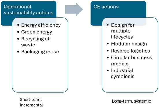 This paper presents findings from an interview study conducted in seven different industrial manufacturing companies in Sweden. The purpose was to understand how industrial manufacturing companies currently work with the reduction in their environmental footprint and the transition into the circular economy. The operational sustainability and circular economy actions in the companies were investigated in relation to the sustainability reporting of the companies, particularly those aligned with the Greenhouse Gas Protocol scopes 1–3. The results showed that the reductions in Scopes 1 and 2 were well underway, while circular economy actions remained at an early stage, with most initiatives still being implemented on a limited scale. The paper discusses the reasons behind this. A key finding is that both corporate reporting and the scientific literature rarely differentiate between CO2 reductions achieved through operational sustainability actions and those resulting from circular economy strategies.