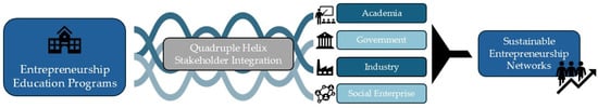 In this study, we propose the Integrated Developmental Entrepreneurship Resiliency Framework (IDERF), a conceptual model positioning universities as orchestrators of stakeholder networks for entrepreneurial resilience and sustainability. Review and analysis of historical and contemporary research revealed gaps in existing approaches to sustainable entrepreneurship. Entrepreneurship education has evolved from isolated curricula to formal programs that incorporate experiential learning and multilateral institutional access, which appreciably enhance entrepreneurial resilience and venture longevity. The integration of resilience theory with entrepreneurship research has identified multi-level sustainment factors across the disciplines of psychology, organizational theory, and structural economic development. The IDERF addresses this limitation by adapting the triple helix model to a quadruple helix framework that encompasses academia, government, industry, and community stakeholders. Our proposed conceptual framework was developed through conceptual synthesis based on a structured literature review of 212 publications on university-led entrepreneurship programs and entrepreneur sustainability and resilience since 1940. Our findings revealed the need for more resiliency-focused entrepreneurship program designs, synthesis between resilience and sustainability education, analysis of educational program impacts on business development sustainability, and practical entrepreneur training in real-world economic contexts. The resulting IDERF encompasses five dimensions of adaptive entrepreneurial capacity, stakeholder governance, economic transformation, social–environmental integration, and institutional reform as novel components of entrepreneurial resilience and sustainability. We propose an integrated mixed-methods research agenda that includes proposed research questions to instigate the development of measurement frameworks and cross-cultural validation to empirically test the IDERF’s effectiveness in fostering entrepreneurial resilience across diverse contexts and economic regions.