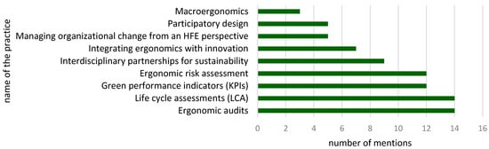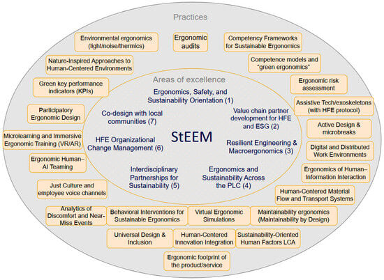 The article aims to determine how ergonomic measures support the achievement of ESG goals and how ergonomics as a discipline can be used in sustainability reporting. The study was designed as a mixed-method approach, started with a systematic review of the literature conducted according to the PRISMA protocol, and was followed by a qualitative analysis of the identified literature. The search strategy was based on a combination of keywords in the areas of ergonomics and environmental management. The results of the review identify the main trends in combination of ergonomics with ESG: Ergoecology, Green ergonomics, Environmental ergonomics, and Immaterial ergonomics, as well as indicating areas of objectives particularly reinforced by ergonomic interventions and documenting examples of good practices valuable for ESG reporting. The main results of the study are as follows: (1) organizing research trends in ergonomics for sustainable development; (2) a systematizing approach to green ergonomic practice; (3) a set of ergonomic practices for sustainability that are most frequently described in the literature; and (4) a conceptual model termed the Sustainability through Ergonomic Excellence Model (StEEM). The proposed framework organizes a range of practices into seven areas of excellence and assigns the collected green ergonomic practices to them, showing their contribution to implementing ESG metrics. The research carried out indicates that the role of ergonomics is still underestimated in current reporting standards. The proposed mapping and StEEM frameworks provide a framework to facilitate the systematic integration of ergonomics into ESG strategies and reporting and to provide a structured foundation for future empirical and evaluative research.