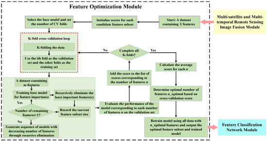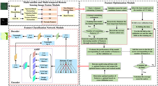 Wetlands, known as “the kidney of the Earth”, serve as critical ecological carriers for global sustainable development. The fine classification of wetlands is crucial to their utilization and protection. Wetland fine-scale classification based on remote sensing imagery has long been challenged by disturbances such as clouds, fog, and shadows. Simultaneously, the confusion of spectral information among land cover types remains a primary factor affecting classification accuracy. To address these challenges, this paper proposes a fine classification model of wetlands in remote sensing images based on multi-temporal data and feature optimization (CMW-MTFO). The model is divided into three parts: (1) a multi-satellite and multi-temporal remote sensing image fusion module; (2) a feature optimization module; and (3) a feature classification network module. Multi-satellite multi-temporal image fusion compensates for information gaps caused by cloud cover, fog, and shadows, while feature optimization reduces spectral characteristics prone to confusion. Finally, fine classification is completed using the feature classification network based on deep learning. Using coastal wetlands in Liaoning Province, China, as the experimental area, this study compares the CMW-MTFO with several classical wetland classification methods, non-feature-optimized classification, and single-temporal classification. Results show that the proposed model achieves an overall classification accuracy of 98.31% for Liaoning wetlands, with a Kappa coefficient of 0.9795. Compared to the classic random forest method, classification accuracy and Kappa coefficient improved by 11.09% and 0.1286, respectively. Compared to non-feature-based classification, classification accuracy increased by 1.06% and Kappa coefficient by 1.18%. Compared to the best classification performance using single-temporal images, the proposed method achieved a 1.81% increase in classification accuracy and a 2.19% increase in Kappa value, demonstrating the effectiveness of the model approach.
