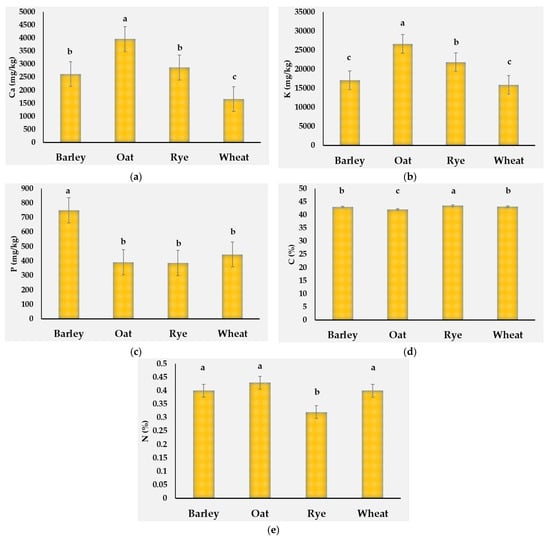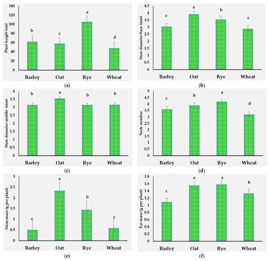 Potassium (K) fertilization plays a key role in regulating stem morphology, particularly stem diameter, yet the influence of different K fertilizer formulations on stem structure and tensile strength remains insufficiently understood. Cereal straw is a key lignocellulosic by-product with growing importance in the circular bioeconomy. Thus, the aim of this study was to determine the links between potassium nutrition, stem structure, and mechanical behavior for four cereal species: wheat, barley, rye, and oats. There were three potassium fertilization levels (0, 60, and 120 kg K ha−1) conducted in a field experiment in eastern Croatia (2021/2022). At maturity, stem morphology, macroelements (Ca, K, P, C, N), acid detergent fiber (ADF), neutral detergent fiber (NDF), and uniaxial tensile properties (maximum force, tensile strength, Young’s modulus) were determined. Cereal species was the dominant source of variation (p < 0.0001) for all traits, whereas the main effect of K was generally weak and significant only for stem diameter at the midpoint and N concentration, although K × species interactions were frequent. Oats and rye showed the most vigorous biomass production, whereas wheat exhibited by far the highest tensile strength (about 120 MPa) and stiffness (6.23 GPa), together with the highest ADF, while barley had the greatest NDF. Oat stems had the lowest ADF and NDF, indicating less lignified, more digestible tissues but mechanically weaker straw. Mechanical traits were tightly and positively correlated with ADF, NDF, and CN ratio, whereas P showed weak or negative associations with plant size and strength. Therefore, for targeted straw valorization, cereal species selection is paramount, with potassium fertilization playing a secondary, species-dependent role.