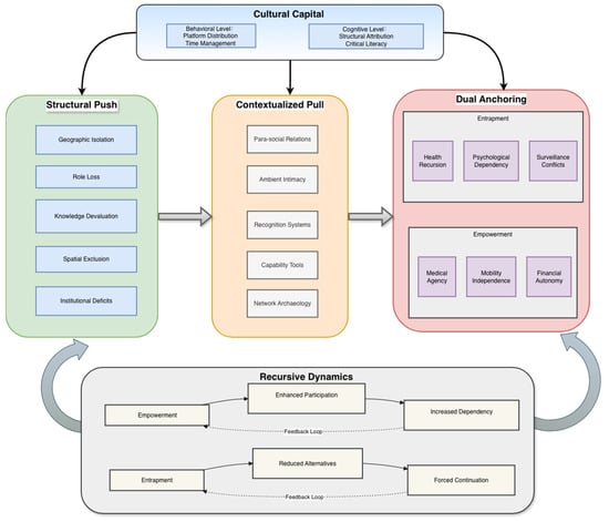 Despite extensive research on smartphone phubbing among youth, its manifestation among older adults remains overlooked in digital sustainability frameworks. This study challenges pathological framings by examining phubbing as potential compensation for structural constraints in China’s urban aging context. Adopting a theoretical thematic analysis approach, we interviewed 24 urban Chinese older adults (aged 60–75, daily smartphone use >4 h) from April to September 2024. Data underwent three-stage NVivo coding, distilling 156 initial codes into 19 thematic categories and five analytical dimensions through iterative refinement and member checks. Analysis revealed smartphone phubbing as structured compensation driven by push factors (empty-nest loneliness, mandatory retirement, epistemic devaluation) and pull factors (affordance-need matching). Cultural capital stratified outcomes: high-capital users attributed difficulties to ageist design while low-capital users internalized failures. Recursive feedback loops transformed use into dependency traps with health and financial consequences. Extending Push–Pull–Mooring theory, we developed a Digital Compensation Framework identifying epistemic inequality as a third-order digital divide. By reframing phubbing as a structural issue and advocating interventions addressing institutional foundations through universal design and platform responsibility, the framework illuminates pathways toward sustainable digital aging and directly advances UN Sustainable Development Goals for health (3), industry (9), equality (10) and partnership (17).