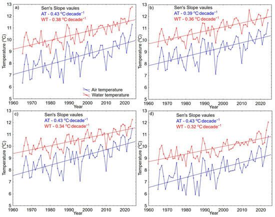 Large rivers are crucial for the functioning of individual regions and entire countries. However, despite their importance, relevant data allowing for a full assessment of the processes and phenomena occurring within them are often lacking. In the contemporary context, climate change has become a key factor affecting river ecosystems, leading to transformations in one of their fundamental characteristics—thermal conditions. This study analyzes the relationships between air temperature and water temperature in the four largest rivers in Poland, using a diversified methodological approach (wavelet analysis, lag non-linear models, copula), which broadens the current understanding of rivers in Central Europe. All three analytical paths confirmed a strong relationship between the two media, forming a basis for further research aimed at addressing data gaps and determining the direction and rate of changes over the period 1965–2024. All cases showed a statistically significant positive trend, with rates varying slightly from 0.32 to 0.38 °C · decade−1 (an average increase of 0.35 °C · decade−1). The ongoing transformation of the thermal regime—its scale and rate—should be taken into account in interdisciplinary studies of river ecosystems, as well as by agencies responsible for water resource management. This issue is particularly important in the context of sustainable development, where the economic use and ecological condition of river systems are closely linked to water temperature.