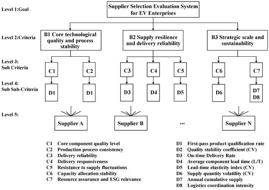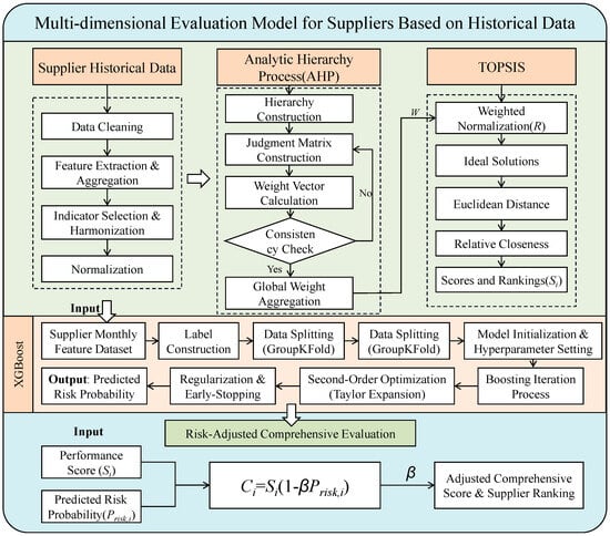 As the supply chain of the electric vehicle (EV) industry becomes increasingly complex and vulnerable, traditional supplier evaluation methods reveal inherent limitations. These approaches primarily emphasize static performance while neglecting dynamic future risks. To address this issue, this study proposes a comprehensive supplier evaluation model that integrates a hybrid Analytic Hierarchy Process (AHP) and Technique for Order Preference by Similarity to Ideal Solution (TOPSIS) framework with the Extreme Gradient Boosting (XGBoost) algorithm, contextualized for the EV sector. The hybrid AHP-TOPSIS framework is first applied to rank suppliers based on multidimensional performance criteria, including quality, delivery capability, supply stability and scale. Subsequently, the XGBoost algorithm uses historical monthly data to capture nonlinear relationships and predict future supplier risk probabilities. Finally, a risk-adjusted framework combines these two components to construct a dynamic dual-dimensional performance–risk evaluation system. A case study using real data from an automobile manufacturer demonstrates that the hybrid AHP–TOPSIS model effectively distinguishes suppliers’ historical performance, while the XGBoost model achieves high predictive accuracy under five-fold cross-validation, with an AUC of 0.851 and an F1 score of 0.928. After risk adjustment, several suppliers exhibiting high performance but elevated risk experienced significant declines in their overall rankings, thereby validating the robustness and practicality of the integrated model. This study provides a feasible theoretical framework and empirical evidence for EV enterprises to develop supplier decision-making systems that balance performance and risk, offering valuable insights for enhancing supply chain resilience and intelligence.
