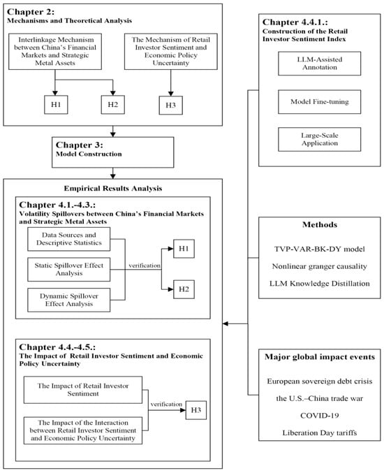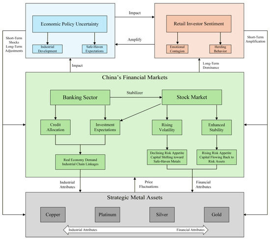 This study employs a TVP-VAR-BK-DY framework to examine volatility spillovers between China’s financial markets and strategic metal assets. To capture retail investor sentiment, we construct a sentiment index using an LLM knowledge distillation framework. Building on this index, the analysis further incorporates economic policy uncertainty to investigate the joint effects of retail investor sentiment and economic policy uncertainty on cross-market volatility spillovers. The results show that: (1) Price movements in certain assets exhibit leading effects, while metals with stronger financial characteristics generate more pronounced spillover effects. (2) The spillover structure between China’s financial markets and strategic metal assets displays substantial heterogeneity across time horizons and frequency bands. In the 1–5-day frequency band, the stock market serves as a net transmitter of volatility to the banking sector, gold, and copper. In the frequency band exceeding five days, these three assets exert reverse net spillover effects on the stock market. (3) The effects of retail investor sentiment and economic policy uncertainty on volatility spillovers differ significantly. The impact of retail investor sentiment is primarily concentrated in the 1–5-day frequency band, whereas economic policy uncertainty exhibits significant spillover effects in the frequency band exceeding six months.