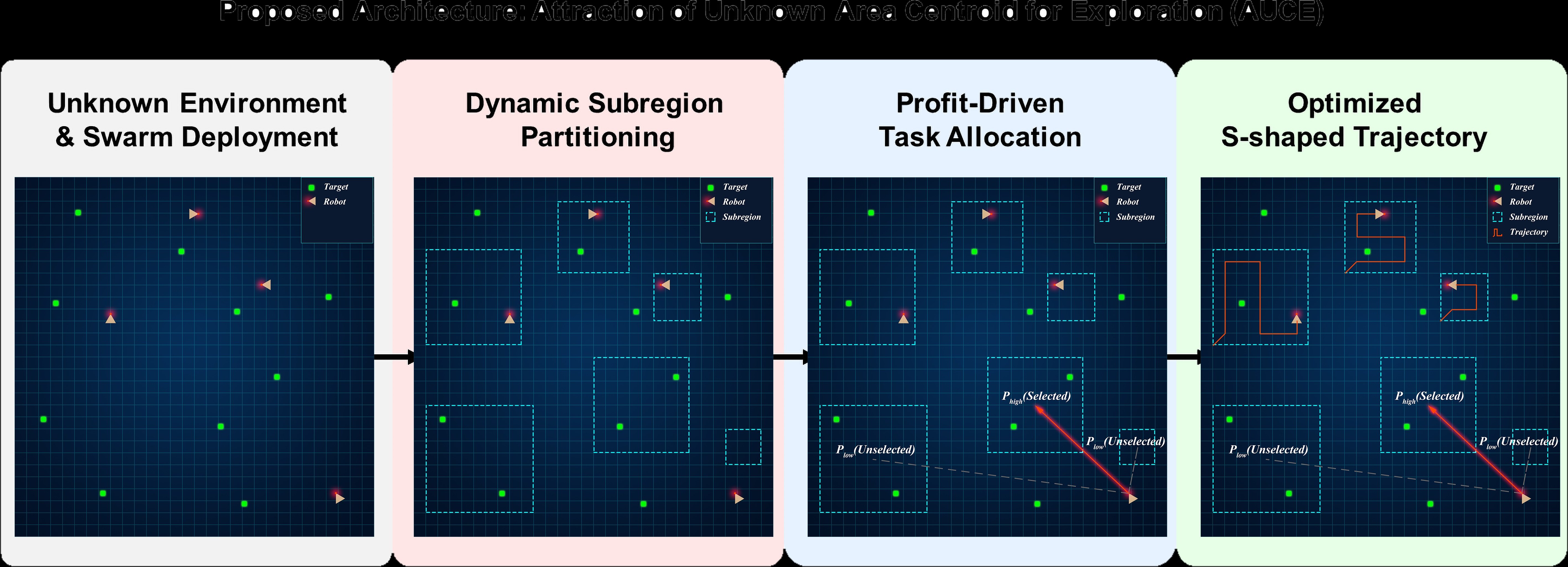 Multi-Robot Systems (MRS) demand optimal spatial resource configuration to ensure systemic efficiency in mission-critical applications. Conventional paradigms rely on rigid coverage-first principles, prioritizing exhaustive spatial scanning over rapid target discovery, thereby compromising systemic responsiveness. To bridge this gap, this study proposes the Attraction of Unknown area Centroid for Exploration (AUCE) architecture, a centralized framework designed to simultaneously optimize global exploration efficiency and early-stage target discovery rates. The control framework incorporates a dynamic region planning strategy that adaptively modulates the systemic search focus based on the specific field of view of autonomous agents, alongside an optimized S-shaped trajectory pattern to establish a rigorous balance between localized path simplicity and global coverage. A versatile profit function synthesizing constant and time-varying coefficient strategies explicitly regulates the systemic trade-off between accelerated early-stage target discovery and global path cost minimization. Quantitative simulations demonstrate that AUCE significantly outperforms established methods by mitigating redundant path costs and generating a distinct front-loading effect to accelerate target localization. Subsequent evaluations confirm the framework’s computational scalability in expanded swarms and its systemic adaptability when navigating static obstacles.