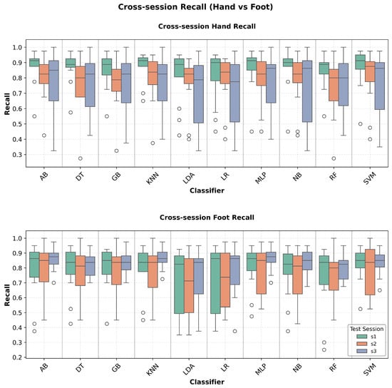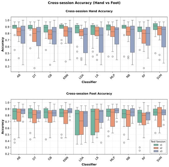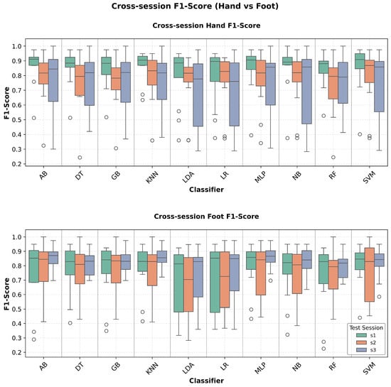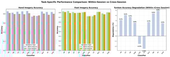 Brain–computer interfaces using motor imagery (MI-BCIs) offer a promising noninvasive communication pathway between humans and engineered equipment such as robots. However, for MI-BCIs based on electroencephalography (EEG), the reliability of the interface across recording sessions is limited by temporal non-stationary effects. Overcoming this barrier is critical to translating MI-BCIs from controlled laboratory environments to practical uses. In this paper, we present a comprehensive dual-validation framework to rigorously evaluate the temporal robustness of EEG signals of an MI-BCI. We collected data from six participants performing four motor imagery tasks (left/right hand and foot). Features were extracted using Common Spatial Patterns, and ten machine learning classifiers were assessed within a unified pipeline. Our method integrates within-session evaluation (stratified K-fold cross-validation) with cross-session testing (bidirectional train/test), complemented by stability metrics and performance heterogeneity assessment. Findings reveal minimal performance loss between conditions, with an average accuracy drop of just 2.5%. The AdaBoost classifier achieved the highest within-session performance (84.0% system accuracy, F1-score: 83.8%/80.9% for hand/foot), while the K-nearest neighbors (KNN) classifier demonstrated the best cross-session robustness (81.2% system accuracy, F1-score: 80.5%/80.2% for hand/foot, 0.663 robustness score). This study shows that robust performance across sessions is attainable for MI-BCI evaluation, supporting the pathway toward reliable, real-world clinical deployment.