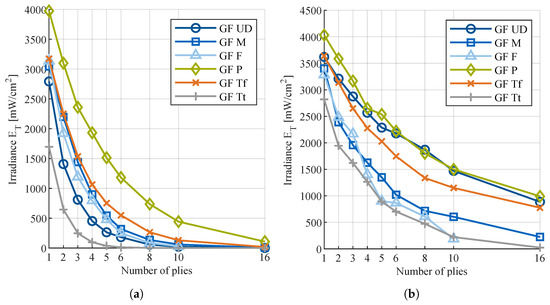 As the importance of sustainability and performance increases, new developments in the manufacturing of fiber-reinforced polymer composites (FRPC) are requested. Ultraviolet (UV) curing offers a faster, more economical, and eco-friendlier alternative to conventionally used thermal curing methods, e.g., autoclave curing, but according to extant research, also presents some shortcomings, such as limitations to thin FRPCs and transparent glass fibers (GFs). This study analyses the UV light transmission in different thermoset FRPCs by irradiating various fiber samples on one side, while a sensor on the opposite side measures the transmitted irradiance. The materials investigated include unidirectional (UD) carbon fibers (CF), UD flax fibers (FF), and six GF fabrics with different ply structures. The fiber samples are tested in a dry, non-impregnated state and a resin-impregnated state using a UV-curable vinyl-ester-based resin. The results show that up to 16 plies of five GF fabrics are fully cured within the 20 s irradiation time and still exhibit a relatively high light transmission, revealing the potential of curing thick FRPCs with UV light. Furthermore, up to three plies of non-transparent FFs are cured, which is promising for the UV curing of natural fibers.