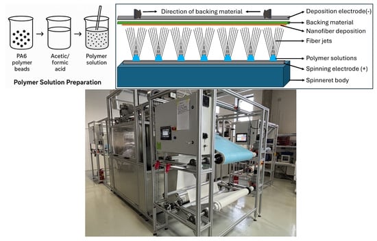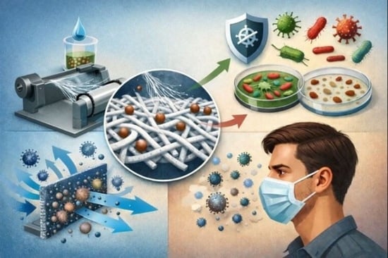 Electrospinning has advanced from a lab technique to an industrial method, enabling modern filters that are high-performing, sustainable, recyclable, and non-toxic. This study produced recycled PA6 nanofibers using green solvents and incorporated non-toxic CuO nanoparticles via industrial free-surface electrospinning. Polymer solutions with concentrations of 12.5, 15.0 and 17.5 (w/v)% were electrospun directly onto recyclable polypropylene spunbond/meltblown nonwoven substrates to produce nanofibers with average fiber sizes of 80–250 nm. Electrospinning parameter optimization revealed that the 12.5 wt.% PA6 solution and the 2–3 mm·s−1 winding speed had the optimal performance, attaining 98.06% filtering efficiency and a 142 Pa pressure drop. The addition of 5 wt.% CuO nanoparticles increased the membrane density and reduced the pressure drop to 162 Pa, thereby improving the filtration efficiency to 98.23%. Bacterial and viral filtration studies have demonstrated pathogen retention above 99%. Moreover, antibacterial and antiviral testing has demonstrated that membranes trap and inactivate microorganisms, resulting in a 2.0 log (≈approximately 99%) reduction in viral titer. This study shows that recycled PA6 can be converted into high-performance membranes using green, industrial electrospinning, introducing innovations such as non-toxic CuO functionalization and ultra-fine fibers on recyclable substrates, yielding sustainable filters with strong antimicrobial and filtration performance, which are suitable for personal protective equipment and medical filtration.