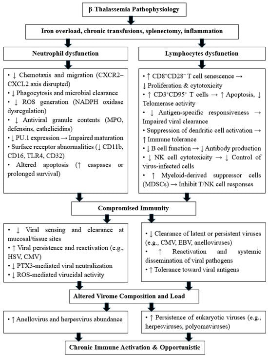 β-thalassemia is a chronic genetic blood disorder characterized by defective β-globin synthesis, requiring frequent transfusions and resulting in iron overload, immune dysfunction, and increased susceptibility to infections. In these immunocompromised patients, altered immune responses lead to significant changes in the human virome, promoting viral persistence, reactivation, and expansion of pathogenic viral communities. This review explores the intricate relationship between β-thalassemia and the human virome, focusing on how clinical interventions and immune abnormalities reshape viral dynamics, persistence, and pathogenicity. Patients with β-thalassemia exhibit profound innate and adaptive immune dysregulation, including neutrophil dysfunction, T cell senescence, impaired B cell and NK cell activity, and expansion of myeloid-derived suppressor cells. These alterations create an immunological niche that favors viral reactivation and virome expansion. Iron overload enhances viral replication, while chronic transfusions introduce transfusion-transmitted viruses. Splenectomy and allo-HSCT further compromise viral surveillance. Additionally, disruptions in the gut virome, particularly bacteriophage-driven dysbiosis, may exacerbate inflammation and impair host–virus homeostasis. The human virome is not a passive bystander but a dynamic player in the pathophysiology of β-thalassemia. Understanding virome–immune interactions may offer novel insights for infection monitoring, risk stratification, and precision therapies in thalassemic patients.