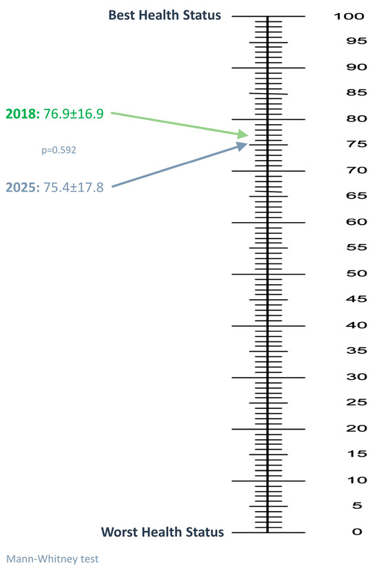 Background/Objectives: Thalassemia significantly affects the mental well-being and lifestyle of patients and their families. This study evaluated the temporal changes in quality of life (QoL) and psychological burden among thalassemia patients in 2025 and in relation to 2018. Methods: Two cross-sectional samples of patients (n = 236) were recruited during 2025 (n1 = 117) and 2018 (n2 = 119) at the Thalassemia Units on Crete/Greece. The EQ-5D-3L Quality of Life Scale, the EQ VAS Index, and the Hospital Anxiety and Depression Scale (HADS) were used through multiple logistic regression analysis to assess relative parameters. Results: High mean Health Status (EQ VAS Index) and QoL scores remained consistent from 2018 to 2025, anxiety mean levels were low and remained consistent from 2018 to 2025, depression levels were low but higher in 2025 in relation to 2018 (p = 0.041), anxiety significantly exceeded depression in both 2018 and 2025, better QoL was associated with improved health status and reduced anxiety and depression, and individuals with children exhibited significantly lower odds of experiencing low or moderate QoL. Conversely, each unit increase in the Anxiety score significantly increased the odds of low or moderate QoL (OR = 1.26, p = 0.002). Similarly, each unit improvement in health status significantly reduced the odds of low or moderate QoL (OR = 0.97, p = 0.009). Conclusions: Health status and QoL remained consistent from 2018 to 2025, while depression levels increased. Anxiety significantly exceeded depression, and better QoL was associated with improved health status and reduced anxiety and depression.