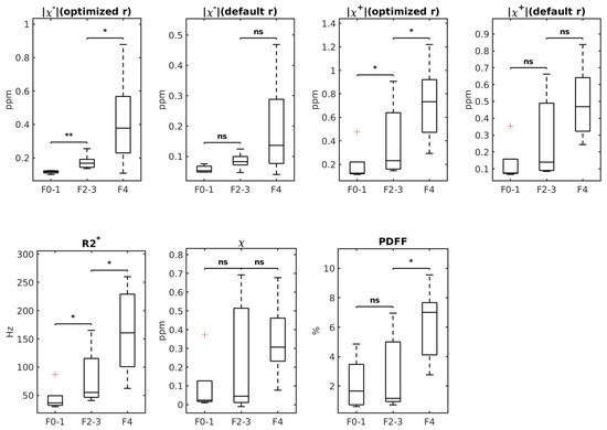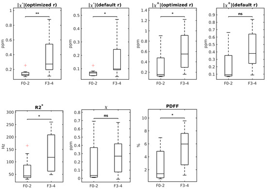 Background/Objectives: Liver fibrosis, if left untreated, can lead to cirrhosis and cancer. The current standard liver biopsy for fibrosis staging is invasive and prone to risks of complication. The objective of this study was to develop a new noninvasive method to quantify fibrosis using diamagnetic susceptibility sources generated from multi-echo gradient echo (mGRE) data with both magnitude decay R2* modeling and phase QSM modeling. Methods: mGRE data of ex vivo liver explants was processed with fat–water separation and then susceptibility source separation. Negative susceptibility was used to measure diamagnetic fibrosis. In 20 formalin-fixed liver explant sections, negative susceptibility maps were compared with other MRI parameters against pathology for fibrosis staging. Results: The correlation between the negative susceptibility sources and the fibrosis stages was evaluated with Spearman coefficients. Negative susceptibility differentiated (i) no or mild fibrosis (stages F0 to F1) from moderate-to-advanced fibrosis (stages F2 to F3; p = 0.0025), (ii) stages F2 to F3 from cirrhosis (stage F4; p = 0.021), and (iii) no-to-moderate fibrosis (stages F0 to F2) from advanced fibrosis or cirrhosis (stages F3 to F4) with a sensitivity of 90%, a specificity of 90%, and a 0.88 Receiver Operating Characteristic Area Under the Curve (AUC) (p = 0.0017). Conclusions: For staging fibrosis, negative susceptibility was superior to other MRI parameters, including R2*, QSM, and PDFF. Negative susceptibility sources were positively correlated with the fibrosis stage (r = 0.60). Negative susceptibility could be valuable for MRI staging in liver fibrosis.