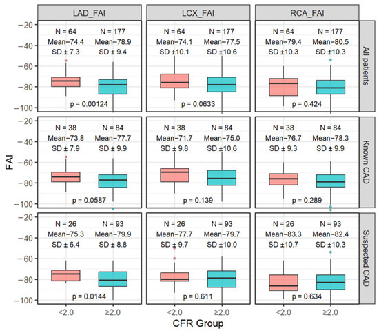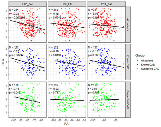 Background: The fat attenuation index (FAI) derived from coronary computed tomography angiography (CTA) is an emerging imaging biomarker of perivascular inflammation. Coronary flow reserve (CFR), assessed by phase-contrast (PC) cine cardiac magnetic resonance (CMR) of the coronary sinus, reflects coronary microvascular function. Although FAI has been linked to adverse outcomes in coronary artery disease (CAD), its relationship with CFR across different CAD stages is not well defined. Methods: We retrospectively evaluated 241 patients (mean age 73.4 ± 10.8 years; 149 men [61.8%]) who underwent both coronary CTA and CMR (122 with known CAD and 119 with suspected CAD). FAI was measured in the proximal left anterior descending (LAD), left circumflex (LCX), and right coronary (RCA) arteries. Impaired CFR was defined as <2.0. Univariable and multivariable logistic regression analyses were performed to identify factors associated with impaired CFR. Results: Impaired CFR was observed in 38 of 122 patients (31.1%) with known CAD and 26 of 119 (21.8%) with suspected CAD. Higher LAD-FAI was associated with impaired CFR in both groups: OR 1.06 (95% CI 1.01–1.11; p = 0.018) in known CAD and OR 1.08 (95% CI 1.02–1.15; p = 0.017) in suspected CAD. Correlation analysis also demonstrated an inverse relationship between LAD-FAI and CFR (p < 0.001), and the strength of association was comparable between the two groups. Conclusions: LAD-FAI was associated with impaired CFR in both suspected and known CAD, with comparable strength of association across the two groups. These findings indicate that perivascular inflammation, reflected by FAI, may relate to coronary microvascular dysfunction in different stages of CAD.