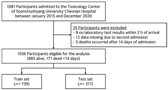 Pesticide poisoning remains a significant public health issue, characterized by high morbidity and mortality, particularly among patients presenting to the emergency department. This study aimed to develop a 14-day in-hospital mortality prediction model for patients with acute pesticide poisoning using early clinical and laboratory data. This retrospective cohort study included 1056 patients who visited Soonchunhyang University Cheonan Hospital between January 2015 and December 2020. The cohort was randomly divided into train (n = 739) and test (n = 317) sets using stratification by pesticide type and outcome. Candidate predictors were selected based on univariate Cox regression, LASSO regularization, random forest feature importance, and clinical relevance derived from established prognostic scoring systems. Logistic regression models were constructed using six distinct feature sets. The best-performing model combined LASSO-selected and clinically curated features (AUC 0.926 [0.890–0.957]), while the final model—selected for interpretability—used only LASSO-selected features (AUC 0.923 [0.884–0.955]; balanced accuracy 0.835; sensitivity 0.843; specificity 0.857; F1.5 score 0.714 at threshold 0.450). SHapley Additive exPlanations (SHAP) analysis identified paraquat ingestion, Glasgow Coma Scale, bicarbonate level, base excess, and alcohol history as major mortality predictors. The proposed model outperformed the APACHE II score (AUC 0.835 [0.781–0.888]) and may serve as a valuable tool for early risk stratification and clinical decision making in pesticide-poisoned patients.