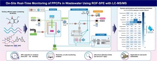 Pharmaceuticals and personal care products (PPCPs) are recognized as emerging contaminants of concern, even at ultra-trace concentrations. However, the current detection systems are prohibitively expensive and typically rely on labor-intensive, lab-based workflows that lack automation in sample pretreatment. In this study, we developed a robotic and on-flow solid-phase extraction (ROF-SPE) system, fully integrated with online liquid chromatography-tandem mass spectrometry (LC-MS/MS), for the on-site and real-time monitoring of 16 PPCPs in wastewater effluent. The system automates the entire pretreatment workflow—including sample collection, filtration, pH adjustment, solid-phase extraction, and injection—prior to seamless coupling with LC–MS/MS analysis. The optimized pretreatment parameters (pH 7 and 10, 12 mL wash volume, 9 mL elution volume) were selected for analytical efficiency and cost-effectiveness. Compared with conventional offline SPE methods (~370 min), the total analysis time was reduced to 80 min (78.4% reduction), and parallel automation significantly enhanced the throughput. The system was capable of quantifying target analytes at concentrations as low as 0.1 ng/L. Among the 16 PPCPs monitored at a municipal wastewater treatment plant in South Korea, only sulfamethazine and ranitidine were not detected. Compounds such as iopromide, caffeine, and paraxanthine were detected at high concentrations, and seasonal variation patterns were also observed This study demonstrates the feasibility of a fully automated and on-site SPE pretreatment system for ultra-trace environmental analysis and presents a practical solution for the real-time monitoring of contaminants in remote areas.