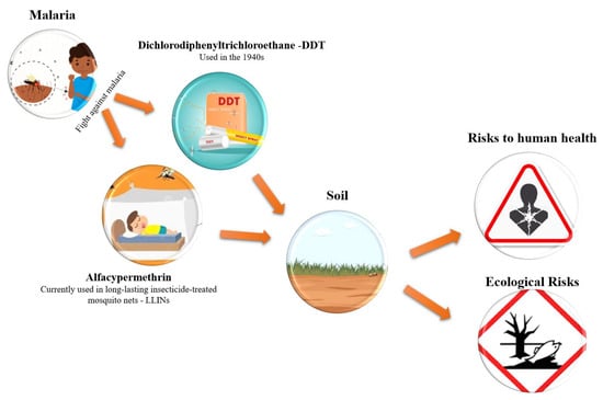 Dichlorodiphenyltrichloroethane (DDT), used in the 20th century to combat malaria, is considered harmful to health and the environment. As an alternative, insecticides such as pyrethroids have been used, especially alphacypermethrin, which is applied in mosquito nets impregnated with long-lasting insecticide (LLIN). This study analyzed the concentrations of DDT and alphacypermethrin in soils from three municipalities in the Legal Amazon (Mazagão, Porto Velho, and Cantá) using gas chromatography. The results showed the presence of DDT and metabolites, indicating slow degradation in the region, especially in Cantá, with an average of 2.694 mg/kg of total DDT. Alphacypermethrin stands out in Porto Velho, with an average of 0.364 mg/kg, possibly due to the use of LLINs. DDT did not represent a significant ecological risk in this study, but it did present risks to human health, mainly through food intake. The incremental lifetime cancer risk (ILCR) indicated potential danger, with values of up to 2.93 × 10−3 for DDT and 1.17 × 10−1 for alphacypermethrin. The total non-carcinogenic risk index (HI) was extreme, with a maximum value of 336.61. The pesticides evaluated did not present an ecological risk, but they do pose risks to human health, indicating irregular use of LLINs and the need for continuous monitoring.