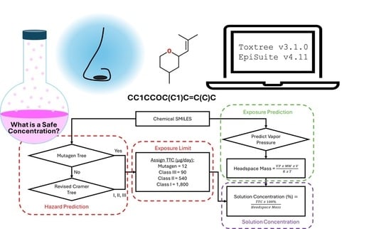 Toxicological risk assessment of chemicals without experimental toxicity data often relies on in silico predictions. However, models designed to predict inhalation toxicity associated with exposure to volatile chemicals in solution are unavailable. The aim of this research was to develop an approach to estimate toxicology-based maximum solution concentrations for novel odorants using in silico structure-based predictions. The decision trees were adapted from established open-source models for assessing mutagenicity (rule-based, ISS in vitro mutagenicity decision tree) and systemic toxicity (revised Cramer decision tree). These were implemented using Toxtree (v3.1.0), a freely available program. Thresholds of toxicologic concern (TTC) were then assigned based on the predicted hazard classification. We then used predicted vapor pressure derived from MPBPWIN™ using US EPA EPI Suite to calculate a solution concentration where inhalation exposure to a defined headspace volume would not exceed the TTC. The approach was evaluated using a published dataset of 143 chemicals with repeat exposure inhalation toxicity data, yielding health-protective predictions for 98.6% of the test set. This demonstrates that the proposed in silico approach enables the estimation of safe toxicology-based maximum solution concentrations for chemicals using open-source models and software.