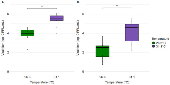 Dengue virus (DENV) is a major public health concern in tropical and subtropical regions, including the Pacific. Temperature is recognised as a major driver of transmission under climate change. Understanding how higher temperatures may alter DENV transmission is essential to anticipate future dengue risk. Therefore, we assessed the effect of temperature on DENV-1 in Aedes aegypti from New Caledonia. Mosquitoes were orally infected and maintained for 14 days at 26.6 °C (average temperatures during recent outbreaks) or 31.1 °C (SSP5-8.5 scenario projected temperatures). Mosquito bodies, heads, and saliva were analysed separately to determine infection, dissemination, and transmission rates as well as transmission efficiencies. Infectious virus was detected by using a fluorescent focus assay, and viral titres were quantified via TCID50 assays. No significant differences were observed in infection, dissemination, and transmission rates or transmission efficiencies between the two temperatures. However, DENV titres in mosquito bodies and heads were significantly higher at 31.1 °C than 26.6 °C. Our results indicate that elevated temperature increases viral loads within the insect but not the proportion of infectious mosquitoes, highlighting the importance of considering temperature as a key parameter in assessing dengue risk under climate change. Further studies are needed to investigate the effects of temperature on virus–mosquito interactions.
