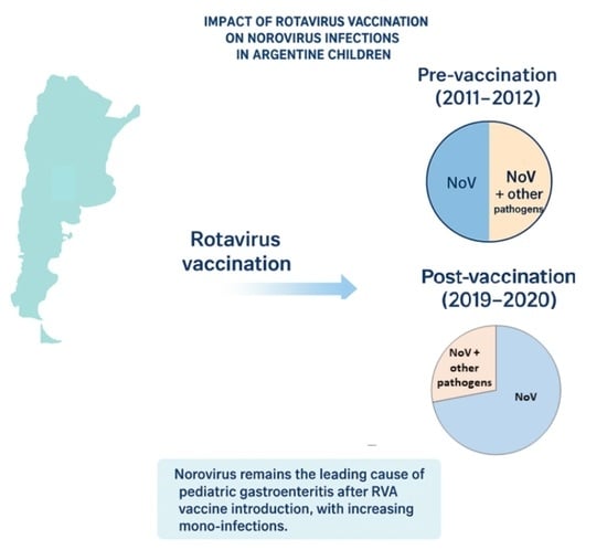 Norovirus (NoV) is a leading cause of acute gastroenteritis (AGE) in young children worldwide. Following the introduction of universal rotavirus (RVA) vaccination in Argentina in 2015, the role of NoV in pediatric AGE warrants evaluation. This study aimed to assess the prevalence, clinical