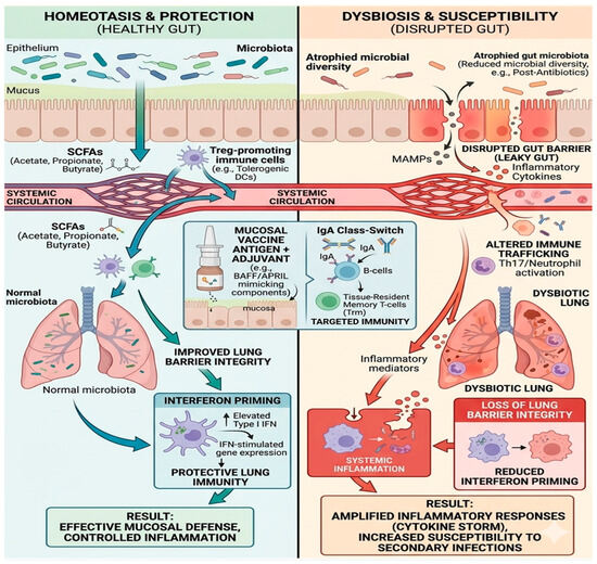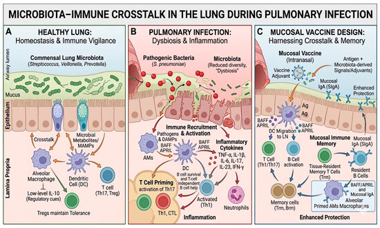 Respiratory infections remain a leading cause of morbidity and mortality worldwide, highlighting the urgent need to better understand host defense mechanisms in the respiratory tract. Recent advances in sequencing technologies have challenged the traditional view of the lungs as sterile organs and revealed the presence of a distinct, low-biomass microbial community known as the lung microbiota. These microbial populations interact closely with airway epithelial cells and immune cells to maintain respiratory homeostasis and regulate host immune responses. In healthy lungs, microbial communities dominated by Firmicutes, Bacteroidetes, and Proteobacteria contribute to immune regulation through interactions with innate and adaptive immune pathways. Microbiota-derived signals are detected by pattern recognition receptors, activating signaling pathways that regulate cytokine production, immune cell recruitment, and T-cell differentiation. In the respiratory mucosa, microbial stimulation can also induce epithelial and antigen-presenting cells to produce B-cell activating factor (BAFF) and a proliferation-inducing ligand (APRIL), which promote immunoglobulin A (IgA) class-switch recombination and support mucosal antibody responses. During pulmonary infection, disruption of microbial communities can lead to dysbiosis that amplifies inflammatory responses, impairs epithelial barrier integrity, and increases susceptibility to secondary bacterial infections. In addition to local microbial interactions, the gut–lung axis represents a key communication pathway linking intestinal microbiota with respiratory immunity through microbial metabolites such as short-chain fatty acids (SCFAs) and immune signaling networks. This review summarizes current insights into microbiota–immune crosstalk in the lung during pulmonary infection and discusses how these interactions may inform mucosal vaccine development. A deeper understanding of host–microbiota interactions may enable microbiome-informed vaccines and therapeutic strategies to improve protection against respiratory diseases.