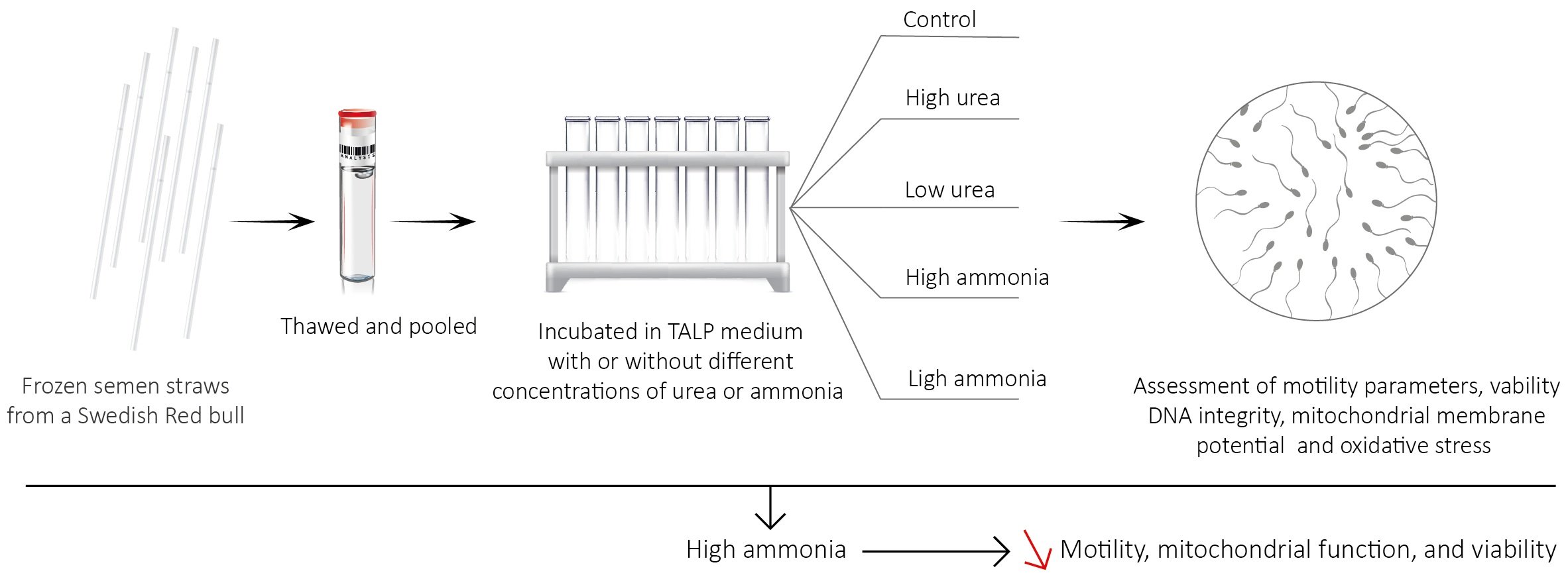 Elevated ammonia and urea, common byproducts of nitrogen metabolism, are increasingly found in dairy cows and may negatively impact reproductive function. However, their effects on bull sperm remain unclear. This study aimed to assess the impact of ammonia and urea at physiologically relevant