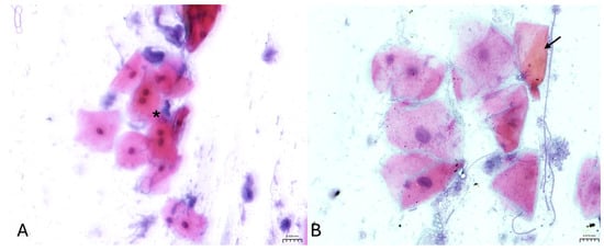 Cigarette smoke contains a high concentration of carcinogenic substances to which smokers are regularly exposed. Passive smoking is seriously harmful to the health of non-smoking humans and animals. Domestic cats are particularly vulnerable because of their constant grooming activity, which can promote oral ingestion of smoke-derived residues. Cotinine, a nicotine metabolite, is a reliable biomarker for tobacco exposure. Considering these observations, our study aimed to (1) characterize cytological alterations in oral mucosal epithelial cells by conventional morphology and automated digital cytomorphometry; (2) quantify urinary cotinine concentration and investigate its possible correlation with oral epithelial cytological alterations. To this aim, oral smears were collected from 30 cats divided into two groups (20 exposed; 10 non-exposed). Smears were stained with May–Grünwald–Giemsa and Papanicolaou to assess inflammation and dysplasia; digital cytomorphometric analysis was used to quantify the nucleus-to-cytoplasm (N/C) ratio. Urinary cotinine was measured by ELISA. Our results showed that exposed cats had significantly higher urinary cotinine levels and higher N/C ratios (p < 0.01) than non-exposed controls, along with mild-to-severe inflammation and dysplastic-like epithelial alterations. These findings support urinary cotinine as a valid biomarker of household tobacco smoke exposure in domestic cats and suggest that such exposure may be correlated with early cytological and cytomorphometric changes in the oral mucosa. Further studies are needed to better investigate the relationship between exposure duration and cytological, cytomorphometric, and molecular alterations.