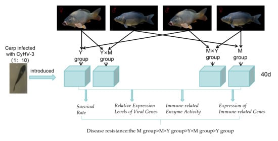 Cyprinid herpesvirus 3 (CyHV-3) is a pathogen that causes high mortality in common carp (Cyprinus carpio) and koi. Common carp breeding lines with different genetic backgrounds exhibit different resistance levels to viral pathogens. This study aimed to determine the differences in CyHV-3 disease resistance performance between the hybrid offspring (Y × M and M × Y) of the mirror carp ‘Longke 11’ (resistant to CyHV-3) and Yellow River carp, as well as the self-crossed offspring (M and Y). The M, Y × M, M × Y and Y groups were infected with CyHV-3 by immersion. The order of mortality and the duration of death for the four groups of carp were as follows: Y group > Y × M group > M × Y group > M group. Throughout the entire infection stage, the mRNA expression levels of the viral factors thymidine kinase (TK) and open reading frame 72 (ORF72) in the four groups of carp tended to first increase but then decrease. The viral factor expression evaluated on days 30 and 31 post-infection (p.i.), which was the peak of infection mortality, was the highest in the Y group and the lowest in the M group, and compared with the Y × M group, the M × Y group had considerably lower viral gene expression (p < 0.05). The immune-related enzyme activity and content levels of the four carp groups matched the patterns of viral gene expression. On day 29 p.i., a time point with high mortality, the levels of alkaline phosphatase (AKP), glutathione peroxidase (GSH-Px) and total antioxidant capacity (T-AOC) were significantly the lowest in the Y group and significantly the highest in the M group, while the Y × M group showed a significant decrease compared to the M × Y group (p < 0.05). Quantitative real-time (q-PCR) analysis revealed that interleukin-21 receptor (IL21R), interferon regulatory factor 9 (IRF9), interferon type I (IFN-I), interleukin-6 (IL-6) and microtubule-associated protein light chain 3 (LC3), exhibited an initial increase followed by a decrease among the four experimental groups of common carp. In the peak mortality period of carp in the four groups (30 days post-infection), the expression levels of IL21R, IRF9, LC3, and IFN-I were significantly the highest in the M group and significantly the lowest in the Y group, with the mRNA expression of these genes in the M × Y group being significantly higher than that in the Y × M group (p < 0.05). In contrast, IL-6 expression levels exhibited the opposite trend. In this study, the M group exhibited the greatest resistance to CyHV-3, followed by the M × Y group, whose resistance was greater than that of the Y × M group, with the Y group showing the lowest disease resistance. Our findings demonstrate that hybridization modulates resistance to CyHV-3. Furthermore, we identified conserved immune signatures common to both susceptible and resistant carp, including the activation of nonspecific immunity and the upregulation of immune-associated genes.