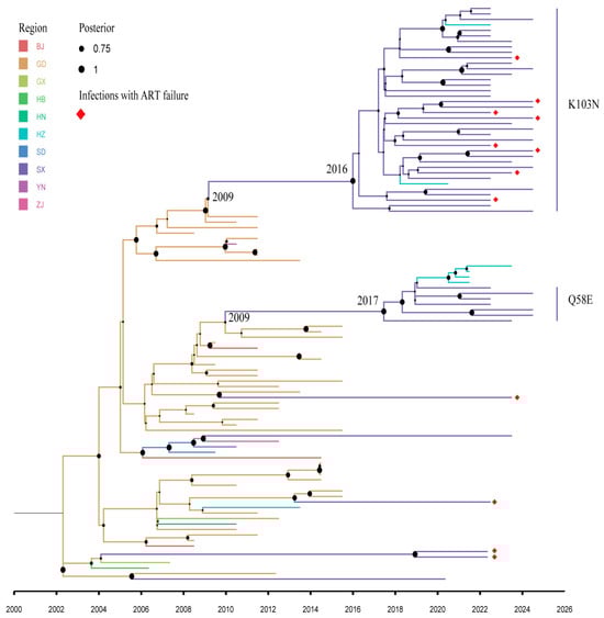 The increasing prevalence of HIV drug resistance poses a significant challenge. This study aimed to investigate the epidemiological dynamics and molecular characteristics of pretreatment drug resistance (PDR) and acquired drug resistance in Shaoxing, Eastern China. Methods: From 2022 to 2024, 571 newly diagnosed HIV-infected individuals and 119 individuals with antiretroviral treatment failure were enrolled. Molecular transmission networks and Bayesian analysis were employed to identify key drug-resistant clusters and trace their origins. Results: The overall PDR prevalence was 14.4% (85/571). PDR to non-nucleoside reverse transcriptase inhibitors (NNRTIs) was 9.8% (56/571), significantly higher than to NRTIs (1.1%, 6/571) and PIs (3.7%, 21/571) (χ2 = 50.014, p < 0.001). Molecular network analysis identified large clusters harboring K103N and Q58E resistance mutations within the CRF07_BC subtype. Bayesian analysis estimated their introduction into Shaoxing from Guangdong Province around 2016 and 2017, respectively. Integrated network analysis revealed close linkages between virological failure and newly diagnosed cases, highlighting the role of treatment failure in resistance transmission. Conclusion: Targeted interventions against specific subtypes and transmission clusters, alongside continuous resistance surveillance, are essential to curb the spread of drug-resistant HIV and optimize ART regimens.