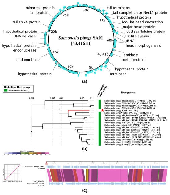 (1) Background: The emergence of multidrug-resistant (MDR) Salmonella enterica poses a major threat to global public health, underscoring the urgent need for alternative therapeutic strategies. Bacteriophages represent a promising alternative due to their high specificity and potent ability to lyse MDR strains. (2) Methods: In this study, we isolated a novel MDR Salmonella Enteritidis-targeting bacteriophage from Lebanese sewage and characterized its host range, thermal and pH stability, and infection dynamics. Whole-genome sequencing was performed using Illumina technology to determine its genetic features and taxonomic classification. (3) Results: the bacteriophage was classified within the genus Jerseyvirus and the class Caudoviricetes with a 43 kb dsDNA genome encoding 66 open reading frames (ORFs). It demonstrated remarkable thermal stability, retaining infectivity after prolonged incubation at 65 °C, and showed a broad host range. The phage formed large, clear plaques, displayed rapid adsorption (>97% within 3 min), a short latent period (20 min), and a burst size of ~32 PFU per cell. Genome analysis revealed no lysogeny, virulence, or resistance genes, confirming its strictly lytic nature and supporting its potential use as a biocontrol agent. (4) Conclusions: These findings identify SA01 as a novel, strictly lytic, and thermally stable bacteriophage with strong potential as a biocontrol agent against multidrug-resistant Salmonella Enteritidis. Its broad host range suggests potential activity also against other Salmonella enterica serovars, supporting its applicability in food safety and biotechnology.