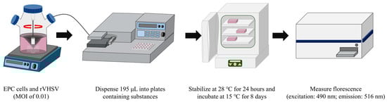 With emerging viruses and drug resistance on the rise, the discovery and development of innovative antiviral substances and agents are necessary for the effective treatment and control of viral outbreaks. Surrogate viruses are safer alternatives used in research to mimic dangerous or hard-to-culture viruses. They enable efficient, ethical, and cost-effective screening of antiviral compounds. In this study, we used a recombinant viral hemorrhagic septicemia virus (rVHSV) expressing enhanced green fluorescent protein as a surrogate for RNA viruses for the high-throughput screening of antiviral agents. An optimized mixture of viruses and EPC host cells was distributed in 96-well plates containing chemical compounds or plant extracts for screening. Using this system, 44,642 chemical compounds and 8104 plant and marine organism extracts were tested; 140 candidates were selected from primary screening, and 8 compounds and 5 plant extracts were further selected based on the selectivity index (SI), representing the ratio of the cytotoxic concentration (CC50) to the inhibition concentration (IC50). Among these, compound 3, which had the highest SI value of 1046, was further tested, considering in vitro activity against VHSV and another fish rhabdovirus, snakehead rhabdovirus (SHRV).