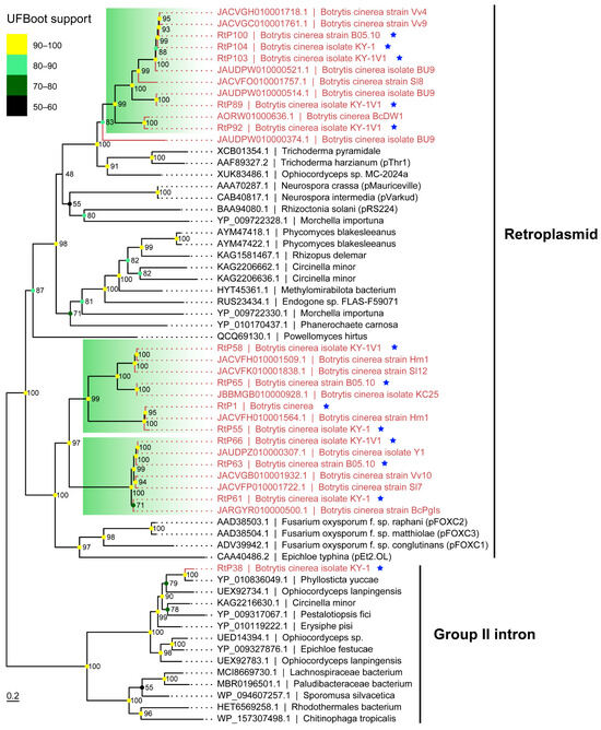 Over the past five years, research has progressively revealed a rich diversity of RNA viruses in Botrytis cinerea. In this study, we identified nine RNA viruses from the viromes of three B. cinerea strains, including five mitoviruses, one umbra-like virus, and three partitiviruses. Among these, Sclerotinia sclerotiorum partitivirus 1 (SsPV1) was artificially introduced in a previous study. Excluding SsPV1, we cloned the other two partitiviruses and confirmed that both belong to Gammapartitivirus and contain three genomic segments, with dsRNA3 as an RNA satellite. In addition to RNA viruses, we discovered 12 retroplasmids in the three B. cinerea strains. These retroplasmids utilize the mitochondrial genetic codes and only encode a single open reading frame, which is predicted to produce a reverse transcriptase. It is also well known that mitoviruses use the mitochondrial genetic codes to encode their RNA-dependent RNA polymerase. Given the similarities between mitoviruses and retroplasmids in several aspects, we suggest that the mycovirus community could consider whether retroplasmids should be included within the conceptual scope of viruses. Furthermore, this study calls on researchers to pay attention to mobile genetic elements beyond typical RNA viruses, such as the retroplasmids reported here. Additionally, it underscores the importance of using single-spore or single-protoplast isolation methods in mycoviral studies to maintain a consistent genetic and viral background when investigating viral effects on the fungal host.